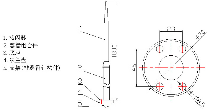 1 安裝方法:將法蘭盤(pán)放置于支架上,并將4 個(gè)安裝孔擺放在便于裝連接螺栓的位置。然后將法蘭盤(pán)與支架焊接在一起,供支承避雷針用。焊接法蘭盤(pán)時(shí)應(yīng)保證法蘭盤(pán)端面水平。將避雷針的底放置在準(zhǔn)備好的支承座上,對(duì)準(zhǔn)安裝孔,裝入4 個(gè)M8 的螺栓,最后用螺母固緊。