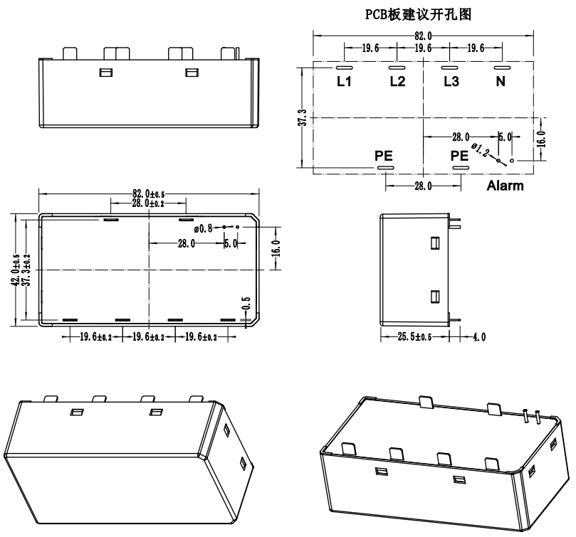 該電涌保護(hù)器采用PCB焊接安裝,PCB板鉆孔如上圖(PCB鉆孔圖)所示:焊接:產(chǎn)品可使用手工焊接或使用波峰焊焊接:手工焊接時(shí)建議使用恒溫烙鐵,溫度設(shè)置400℃±5℃,焊接時(shí)間1~3秒,焊錫絲建議使用常溫焊錫絲;推薦的波峰焊接曲線:預(yù)熱溫度1區(qū):115±5℃;2區(qū):155±5℃;峰值溫度265±5℃;鏈速:1.15~1.25m/min;具體要根據(jù)線路板的不同進(jìn)行調(diào)整。