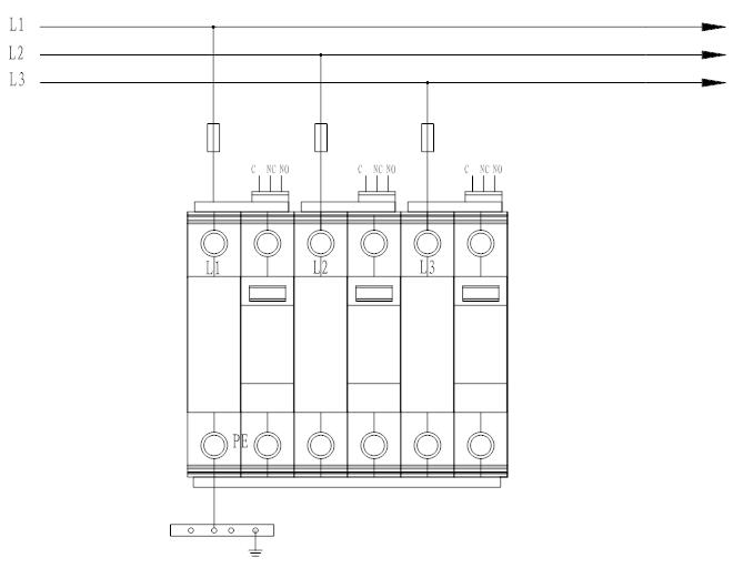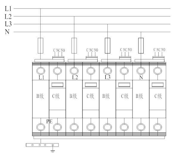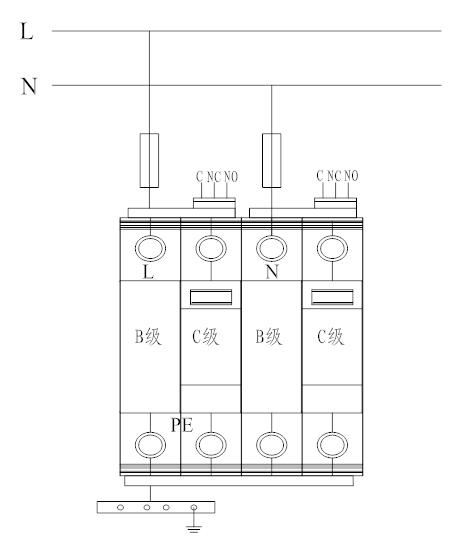 5.3 電源相線(L)、零線(N)分別接入電涌保護(hù)器相應(yīng)接線端子,保證牢固及可靠,將電涌保護(hù)器接地端與地線作良好電氣連接。